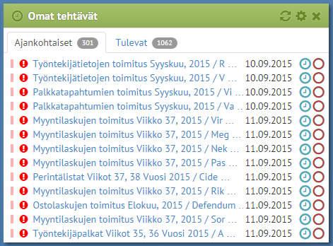 - Ajankohtaista: Listataan kuluvan ja tulevan päivän tehtävät. Lisäksi tässä näytetään myöhässä olevat tehtävät.