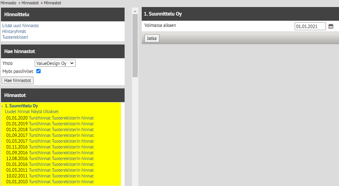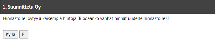 Vanhojen hintojen tuominen hinnastolle nopeuttaa muokkaamista. Vastataan avautuvaan pop-up-ikkunaan "Kyllä".