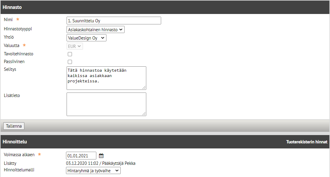 Jos verovapaiden korvauksien hintoja halutaan hallita hinnastokohtaisesti, onnistuu tämä Hinnastojen ylläpito-välilehdeltä lisäämällä jokaiselle hinnastolle uudet hinnat, jotka astuvat voimaan 1.1.2026.