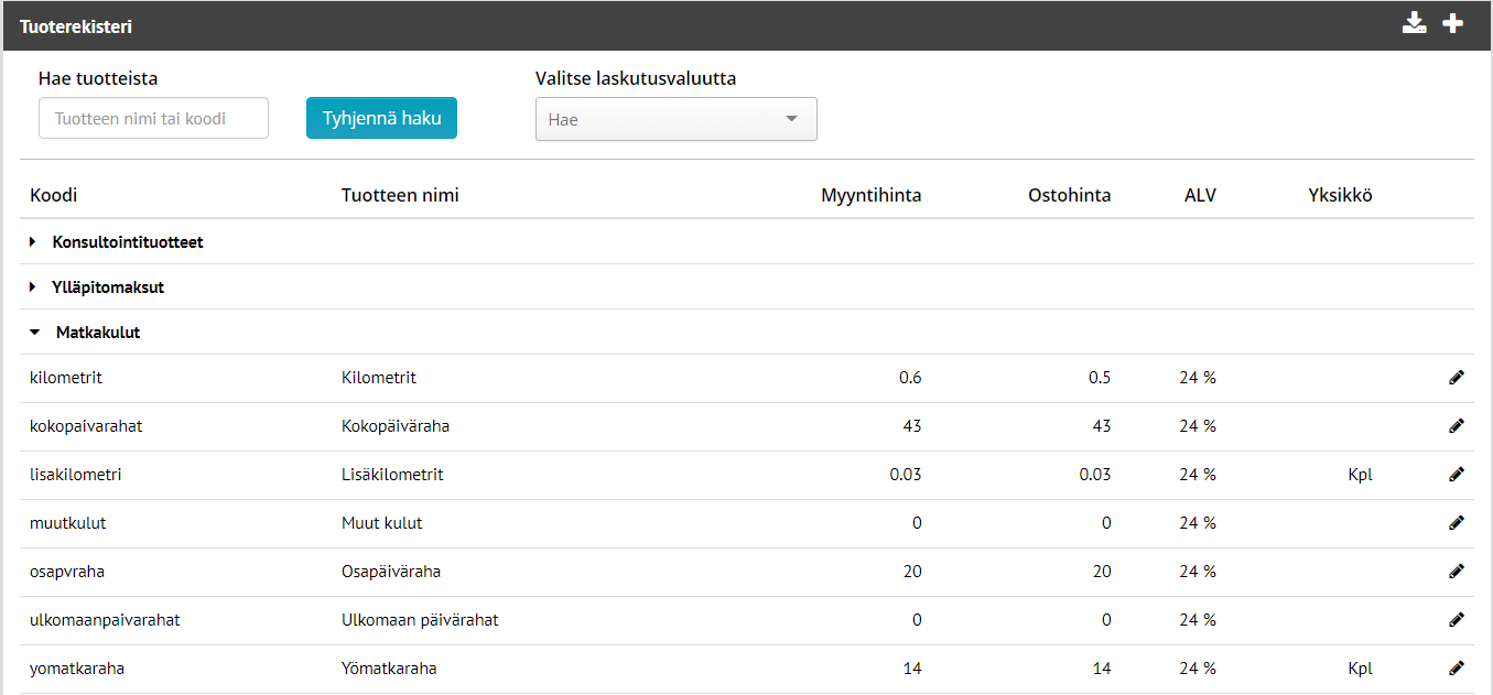Jos käytössänne on matkalaskun laskutuserittely, tuoterekisteristänne löytyvät verovapaiden kilometrikorvausten tuotteet. Pääsette tarkistamaan asian polusta: Hinnasto > Hinnaston ylläpito >Tuoterekisterin ylläpito. Jos näitä tuotteita ei löydy järjestelmästänne, ei toimenpiteitä tarvita.