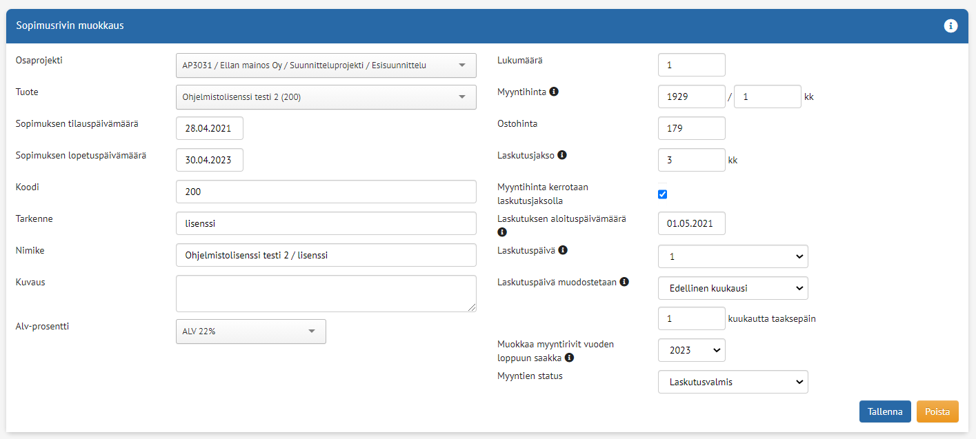 Sopimuslaskutteisten alv-prosenttien päivityksessä tulee huomioida laskutusjakso ja laskutuspäivän muodostuminen verohallinnon ohjeen mukaisesti. Alv-prosentin muokkaamisen yhteydessä uusi alv-prosentti voidaan tallentaa myös laskuttamattomille myynneille valitsemalla haluttu vuosiluku pudotusvalikosta Muokkaa myyntirivit vuoden loppuun saakka. Tällöin laskuttamattomille myynneille tallentuu uusi alv-prosentti valittuun vuosilukuun asti.